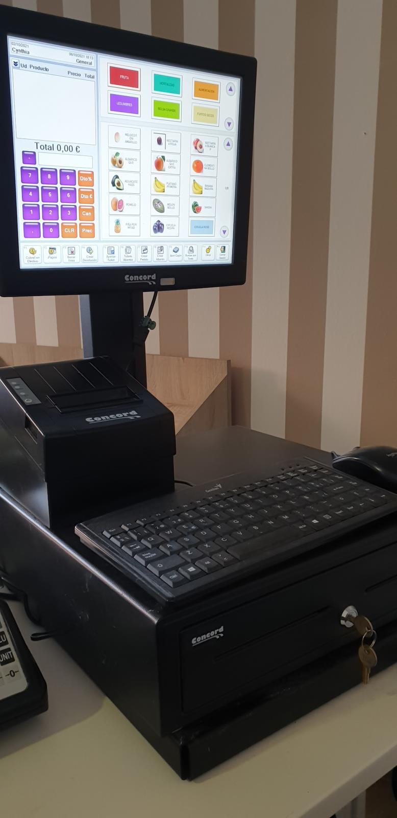 Se trata de un ordenador TPV T con cajón portamonedas, pantalla táctil, impresora térmica, balanza de precisión, teclado y ratón. Incluye programa informático.